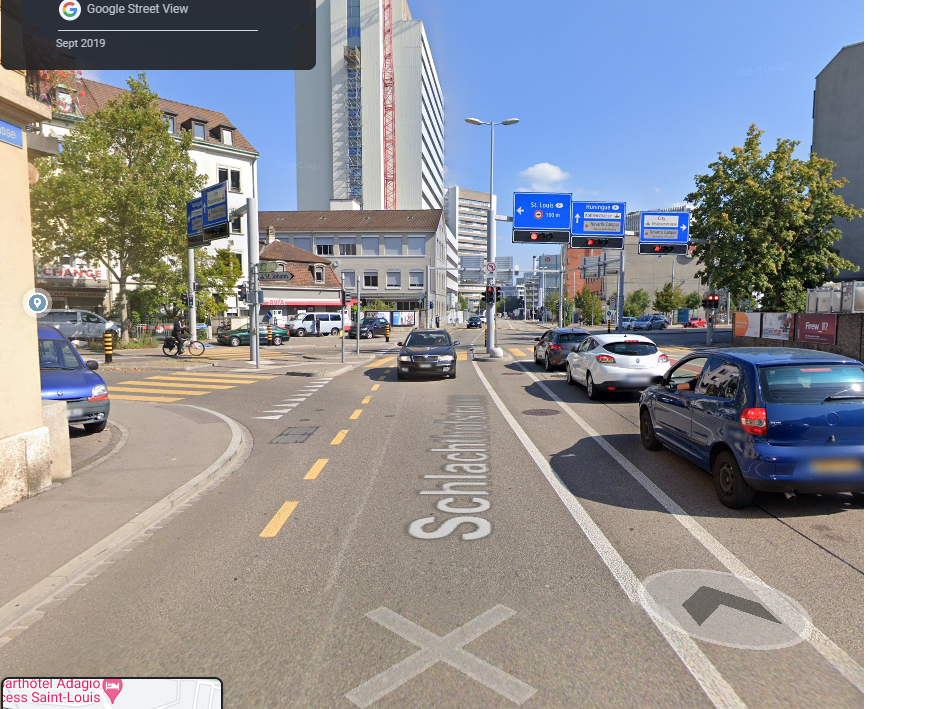 At this junction, take a sharp left onto Elsasserstrasse and you will head on to Saint-Louis in France (passing the old border post), head straight ahead or right and you will head into Basel itself.