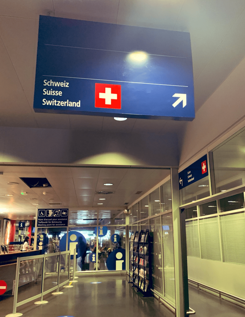 - Inside the airport there are signs directing you to Germany, France or Switzerland – FOLLOW THE ONE FOR SWITZERLAND even if you are going to one of the other two.